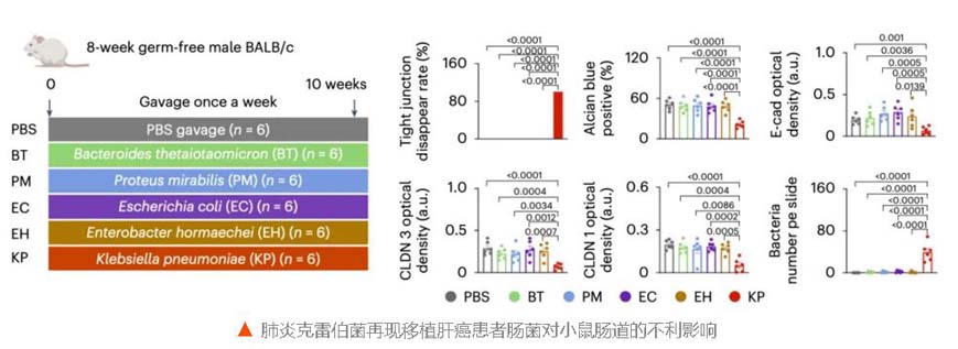 在分析小鼠腸道之后,她們還發現,肺炎克雷伯菌再現了移植肝癌患者腸菌對小鼠腸道的不利影響。