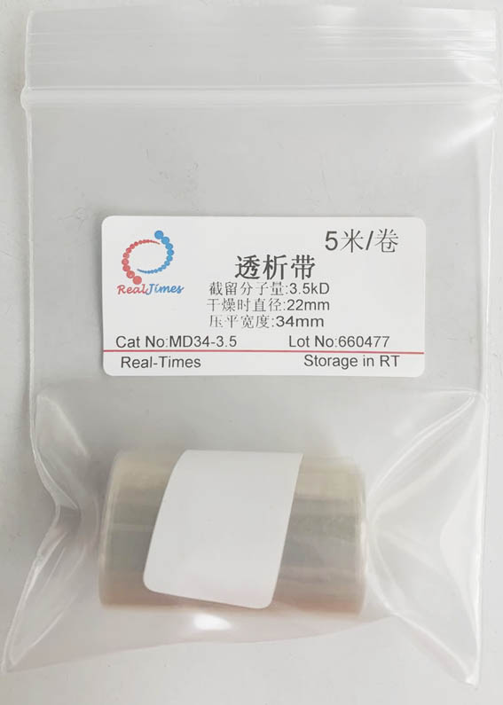透析膜可用動(dòng)物膜和玻璃紙等,但用的最多的還是用纖維素制成的透析膜,目前常用的是美國(guó)Union Carbide (聯(lián)合碳化物公司)和美國(guó)光譜醫(yī)學(xué)公司生產(chǎn)的各種尺寸的透析管,截留分子量MWCO(即留在透析袋內(nèi)的生物大分子的最小分子量)。截留分子量越大也就是說(shuō)透過(guò)性越大。