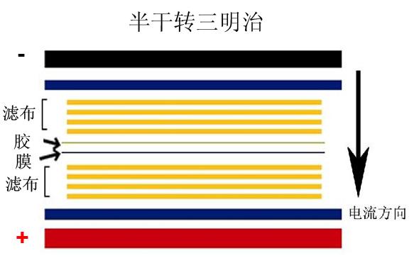 5.1 排列順序(圖一):1 負極(陰極)-2一張超厚濾紙或四層濾布-3 凝膠-4 轉印膜-5一張超厚濾紙或四層濾布-6 正極(陽極)