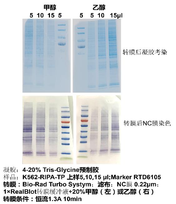 A2:可以使用甲醇代替乙醇,并且使用甲醇配制的轉膜緩沖液轉膜效率要高于乙醇(圖三)。然而,考慮到甲醇的毒性和環境的不友好,請謹慎選擇是否使用。