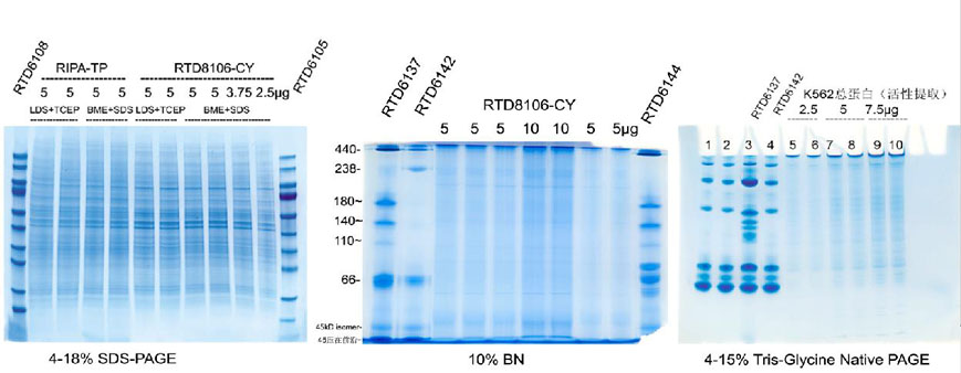 使用該產(chǎn)品提取的蛋白可以用于普通非變性電泳(Laemmli系統(tǒng))(貨號:RTD6130,RTD6135)或Blue