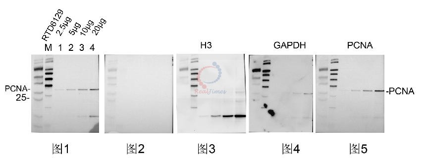 圖5:膜第3次清除后,PCNA檢測:PCNA鼠單抗 1:5000  RT  60 min孵育,羊抗鼠IgG-HRP 1:5000  RT 60min孵育,ECL曝光1秒。